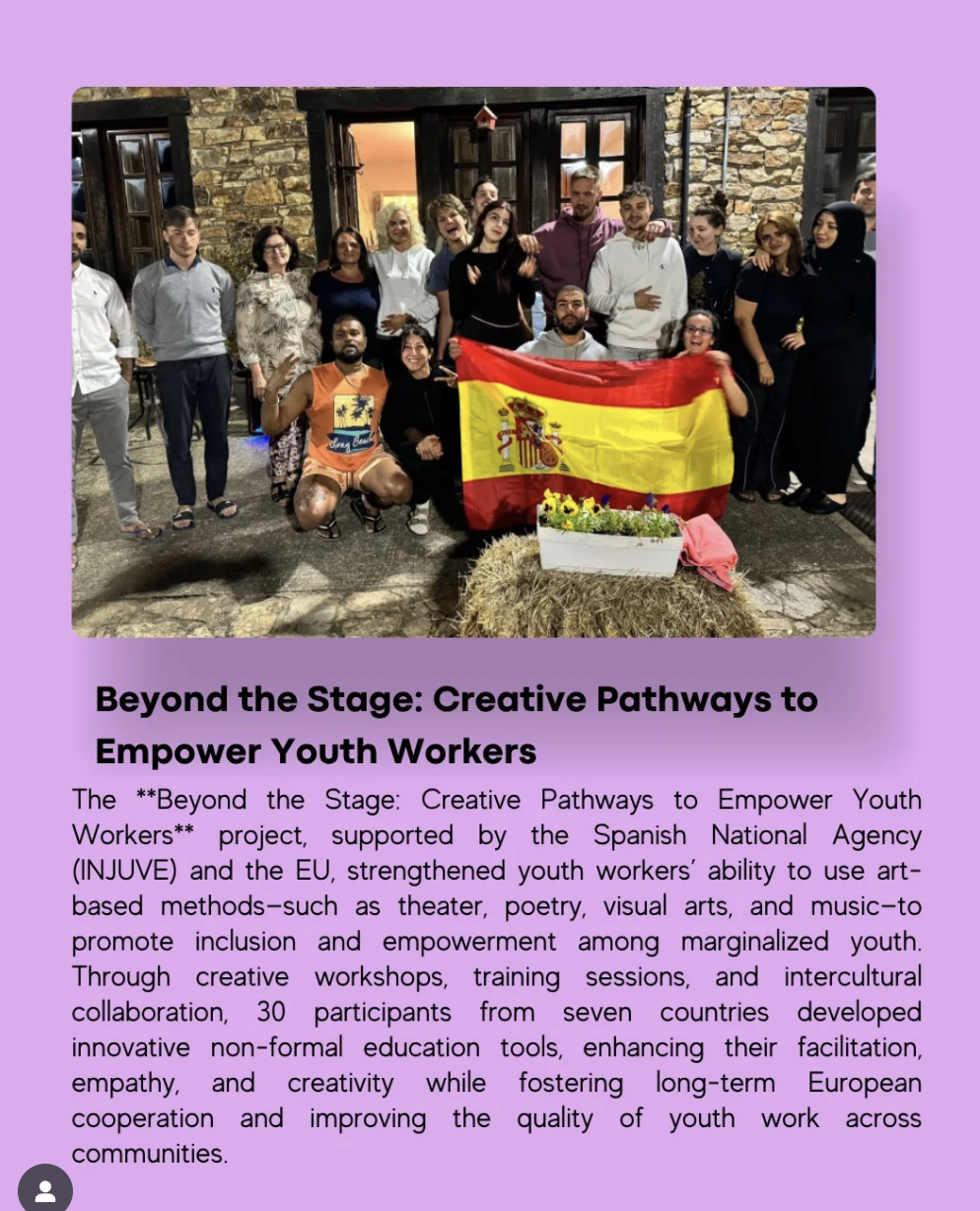 Supported by the Spanish National Agency (INJUVE) and the European Union, this project strengthened the ability of youth workers to use creative, non-formal education tools such as theater, poetry, visual arts, and music. Participants from seven countries took part in collaborative workshops, intercultural learning sessions, and skill-building exercises aimed at fostering empathy, creativity, and inclusion. The project contributed to long-term European cooperation by improving the quality of youth work and empowering communities through innovative art-based approaches.